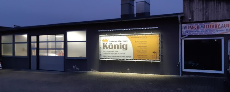 Die große Hallenwand ist zwar gut von einer Haupteinfallstraße aus zu sehen, war bisher aber grau und ungenutzt. Das wollte das Team der Autolackiererei König ändern und fragte bei der WMO an. Gemeinsam entwickelten wir das Konzept für ein beleuchtetes Spannrahmentransparent im Format von etwa fünf mal zwei Metern. Das Motiv ist im witterungsbeständigen Digitaldruck auf einem stabilen und winddurchlässigen Meshbanner aufgebracht. Die Beleuchtung ist in aktueller, energiesparender LED-Technik ausgeführt. Durch eine Zeitsteuerung ist sie außerdem nur zu relevanten Zeiten aktiv, was die Betriebskosten weiter senkt.