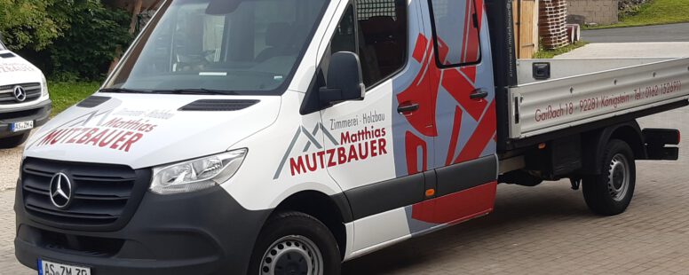 Wenn die Zimmerei wächst, wächst auch der Fuhrpark. Die Gestaltung des Neuzugangs in der Flotte der Zimmerei Matthias Mutzbauer wurde in die Hände der WMO gegeben. Mit Plotter und Digitaldrucker entstand ein auffälliges Design, das auf jeden Fall wiedererkannt wird. Eyecatcher ist das übergroße Zunftzeichen des Zimmererhandwerks auf der Kabine, das sich auch über die hinteren Seitenfenster erstreckt. Dank spezieller Folien für diese Anwendung ist aber dennoch die Sicht frei.